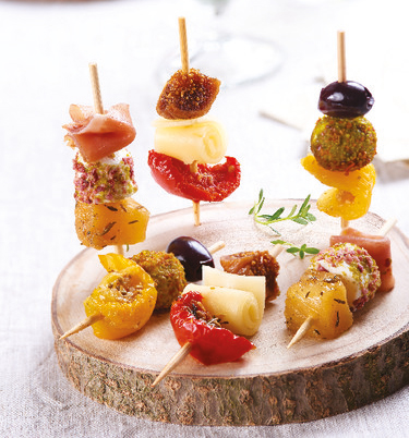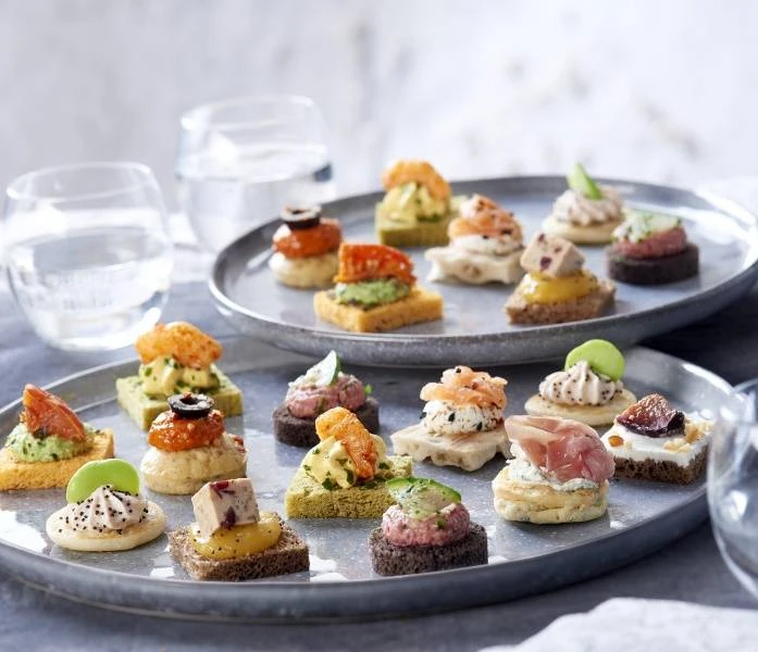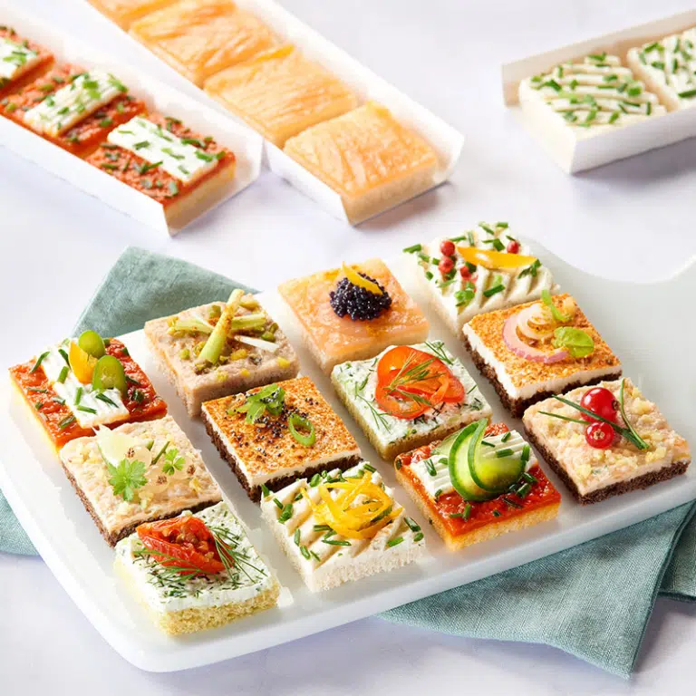 Le Plateau Gourmet Chic se compose de 9 recettes, soit 63 bouchées savoureuses, aux ingrédients sélectionnés : Foie gras origine France, pesto origine Italie ou encore Saumon origine Norvège /Ecosse au travers d’un assortiment sur 7 bases différentes.